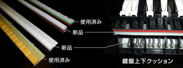 長く使われている電子ピアノのタッチ感が悪くなったり、鍵盤からカタカタと音がするようになるのは、このクッションが劣化しているからです。