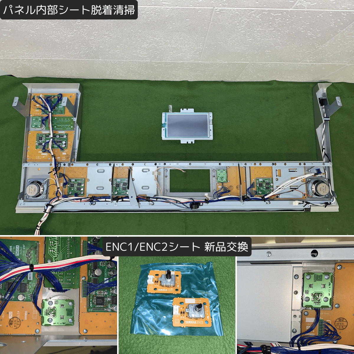 | 本体 | ・本体内部&外装清掃 ・パネル内部シート脱着清掃 ・イヤホンジャック接点洗浄剤注入 ・拍子木(大)上下新品交換 ※画像有り ・POWER、左側パネルボタン3箇所、TENPO、新品交換 ※画像有り(赤枠箇所) ・ENC1/ENC2シート(新品)交換 ・鍵盤蓋塗装補修&アクリル板磨き アクリル板右側キズ有り ・口棒塗装補修 ※画像有り ・本体フレーム各キズ箇所筆差し補修 ※各画像有り |