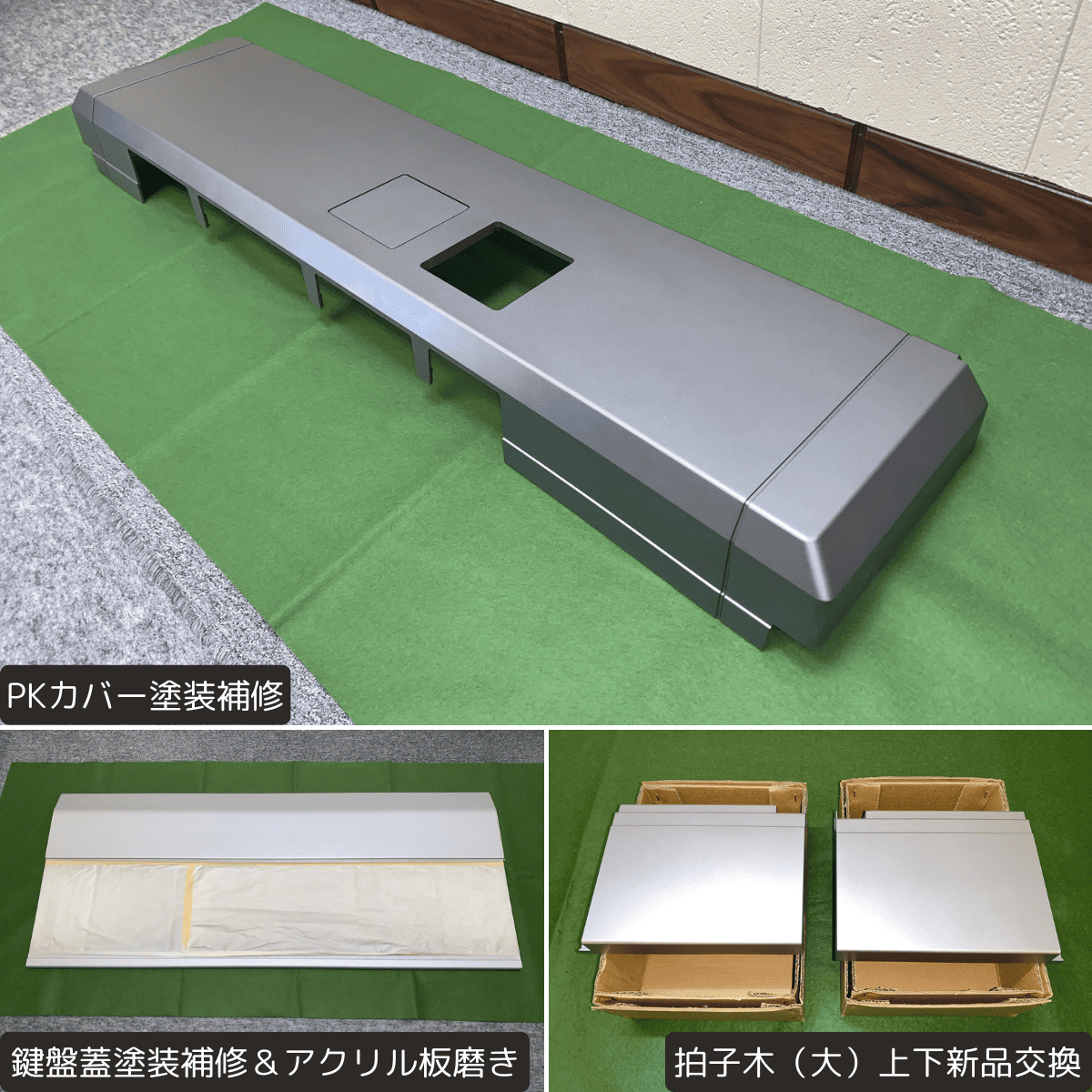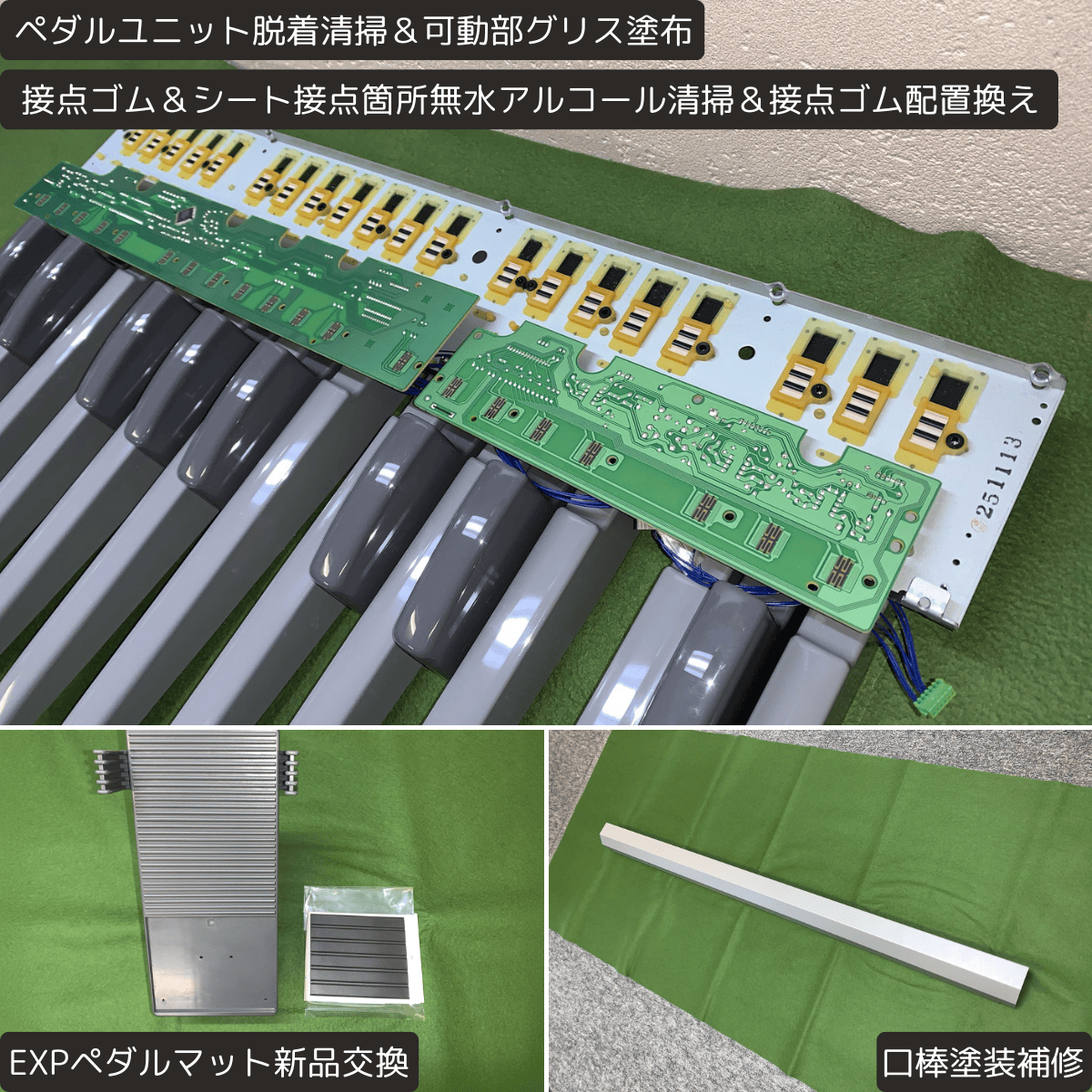 | ペダル | ・ペダルユニット脱着清掃&可動部グリス塗布 ・PKケーブル新品交換 ・EXPペダル:ペダルマット新品交換 ※画像有り ・接点ゴム&シート接点箇所無水アルコール清掃&接点ゴム配置換え ・PKカバー塗装補修 ※画像有り ・鍵盤磨き |