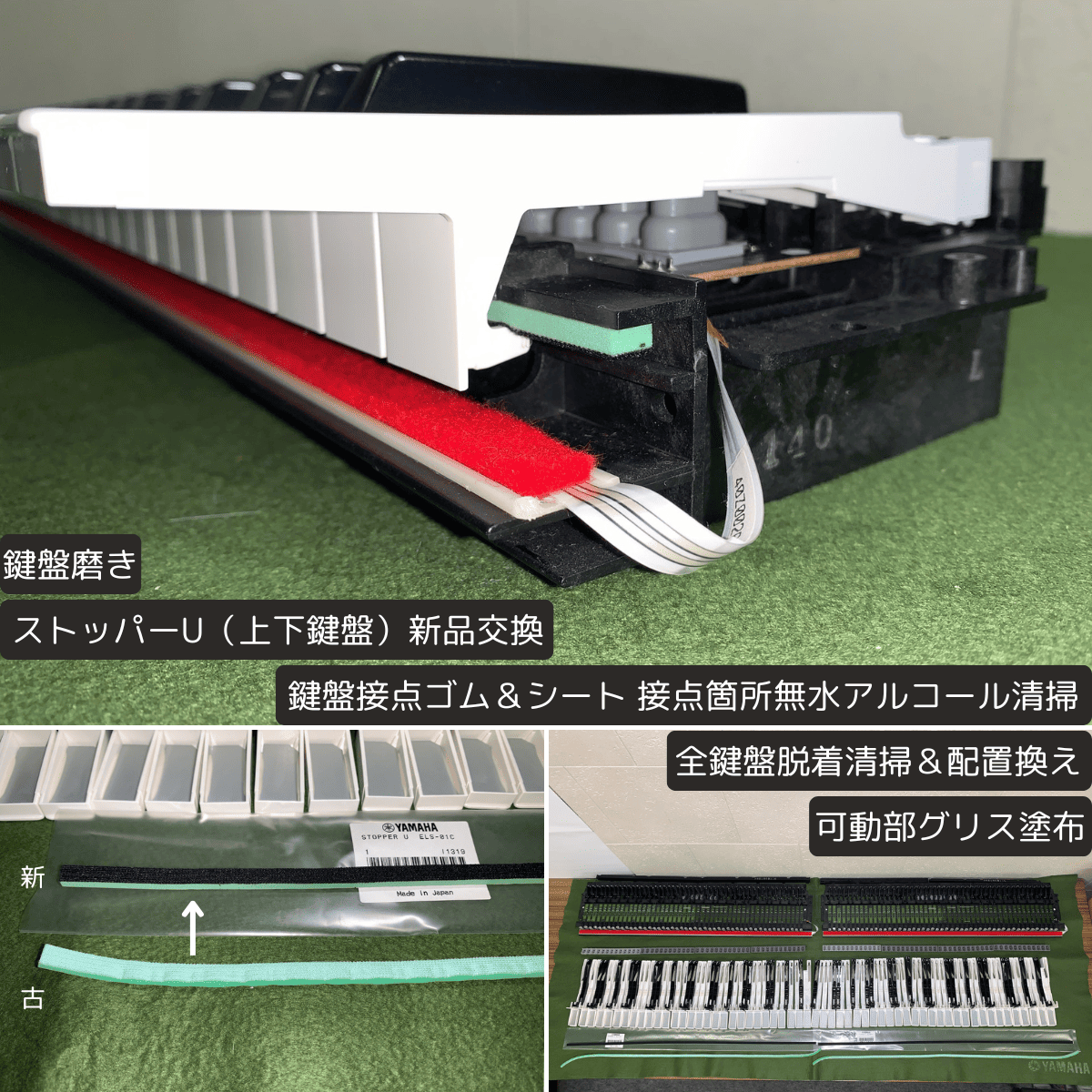 | 鍵盤 | ・全鍵盤脱着清掃&配置換え ・可動部グリス塗布 ・鍵盤接点ゴム&シート 接点箇所無水アルコール清掃 ・ストッパーU(上下鍵盤)新品交換 ・拍子木(大)上下 新品交換 ・鍵盤磨き |