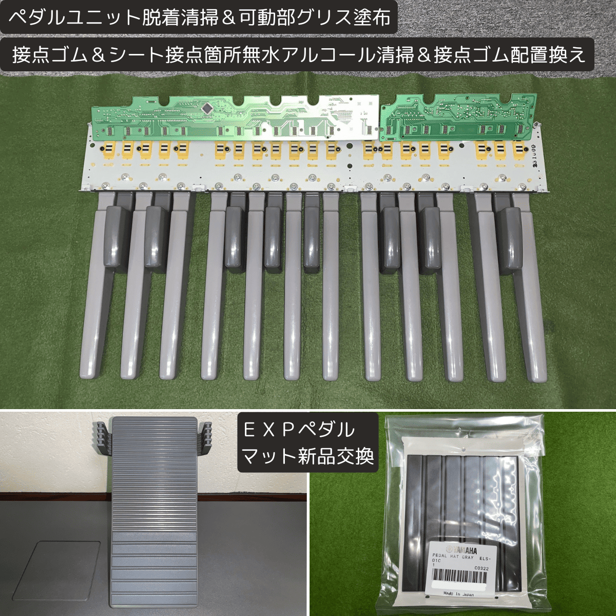 | ペダル | ・ペダルユニット脱着清掃&可動部グリス塗布 ・接点ゴム&シート接点箇所無水アルコール清掃&接点ゴム配置換え ・EXPペダル:マット新品交換 ※画像有り ・PKカバー塗装補修 ※画像有り ・鍵盤磨き |