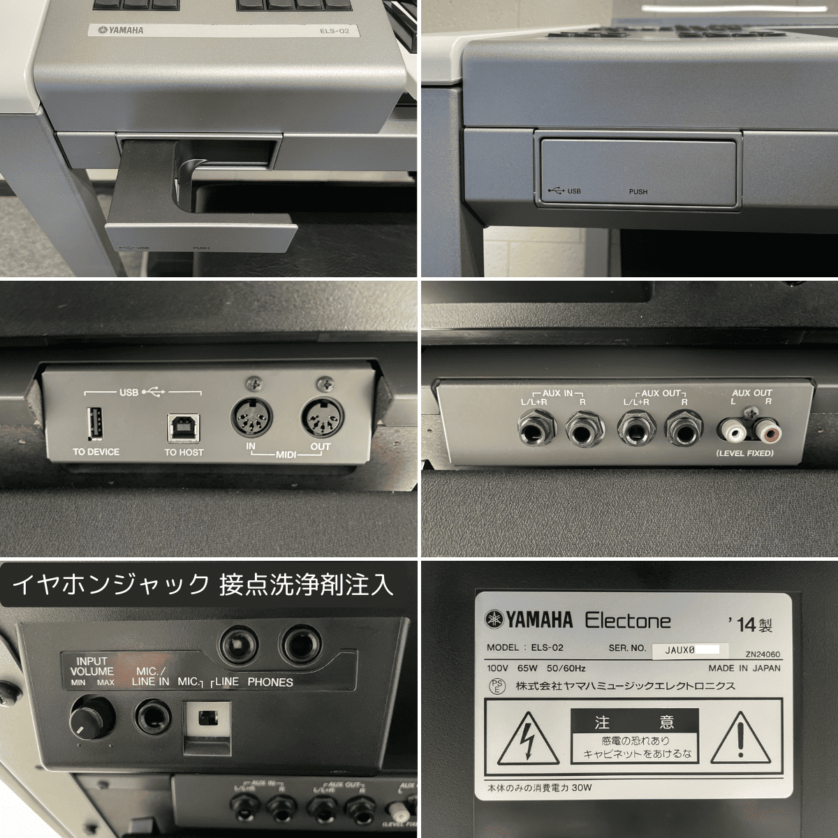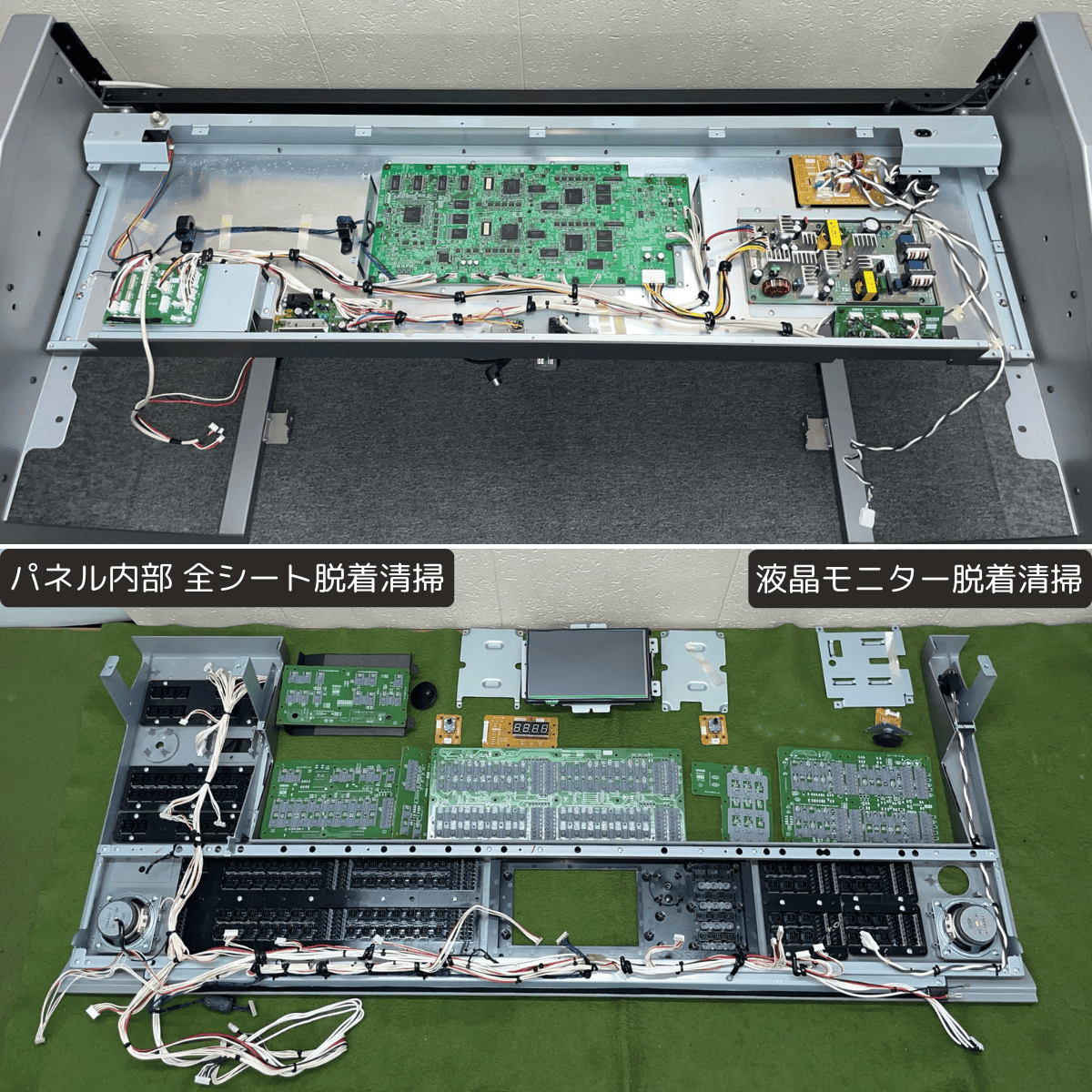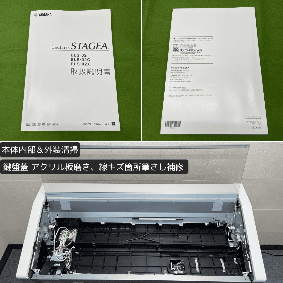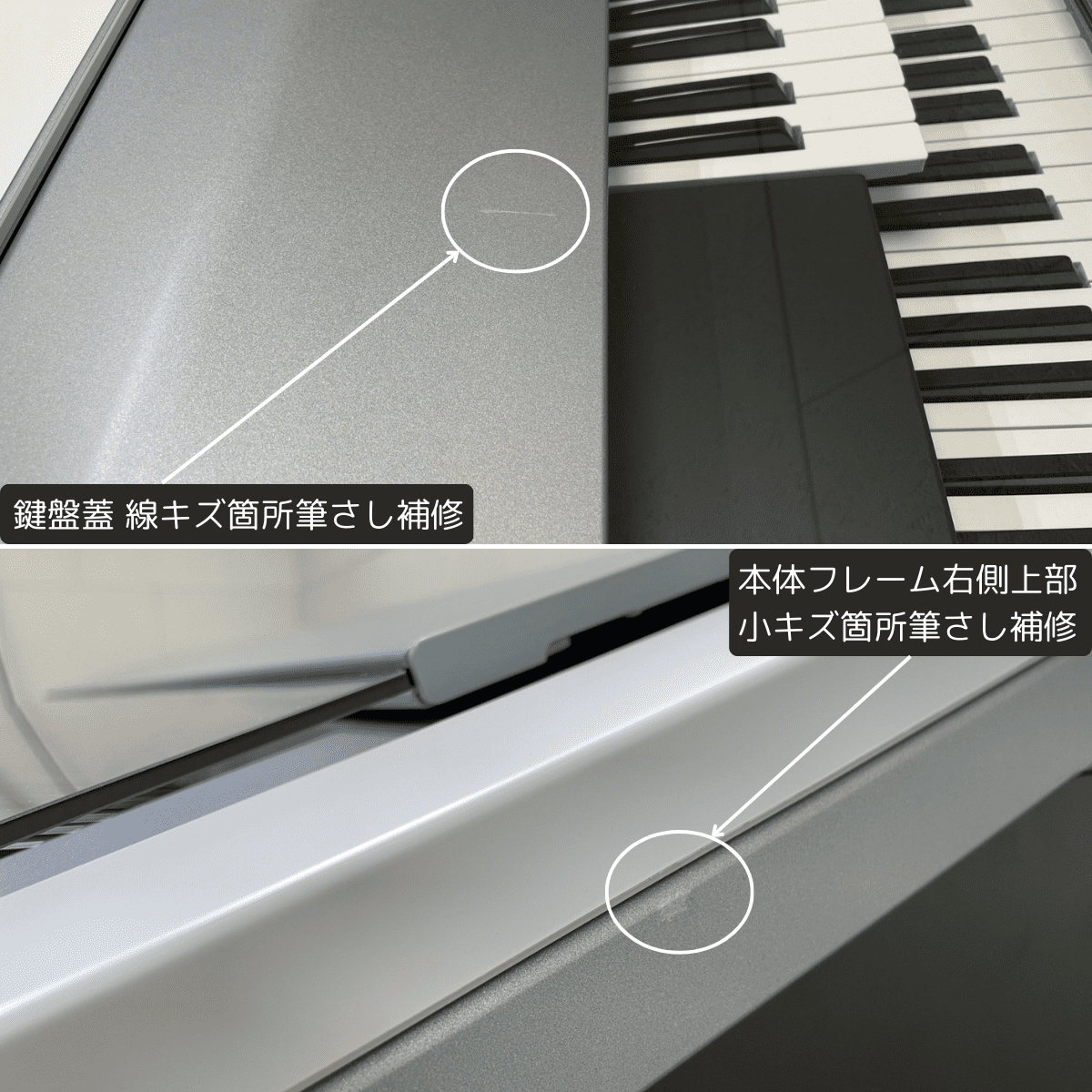 | 本体 | ・内部&外装:清掃 ・パネル内部:全シート脱着清掃 ・イヤホンジャック:接点洗浄剤注入 ・液晶モニター:脱着清掃 ・PKケーブル:新品交換 ★ ・鍵盤蓋:アクリル板磨き、線キズ箇所筆さし補修 ・本体フレーム:台座キャップ4箇所 新品交換 ★ ・本体フレーム:各小キズ箇所筆さし補修 |