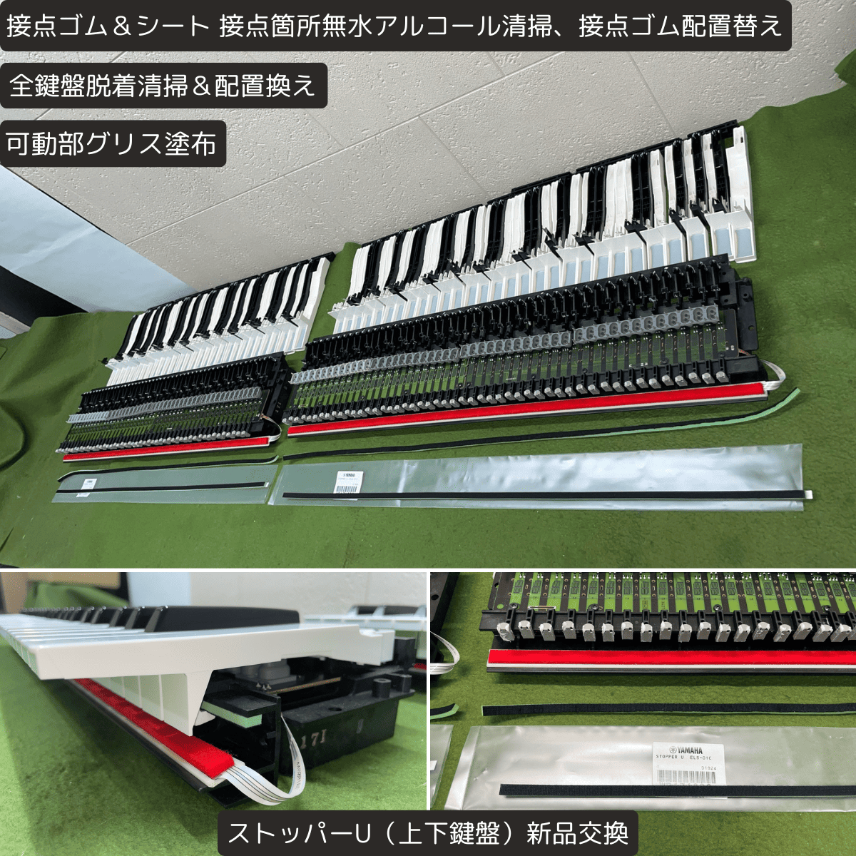 | 鍵盤 | ・全鍵盤脱着清掃&配置替え ・可動部グリス塗布 ・接点ゴム&シート:接点箇所無水アルコール清掃、接点ゴム配置替え ・上下鍵盤:ストッパーU 新品交換 ★ ・コンパウンド磨き |