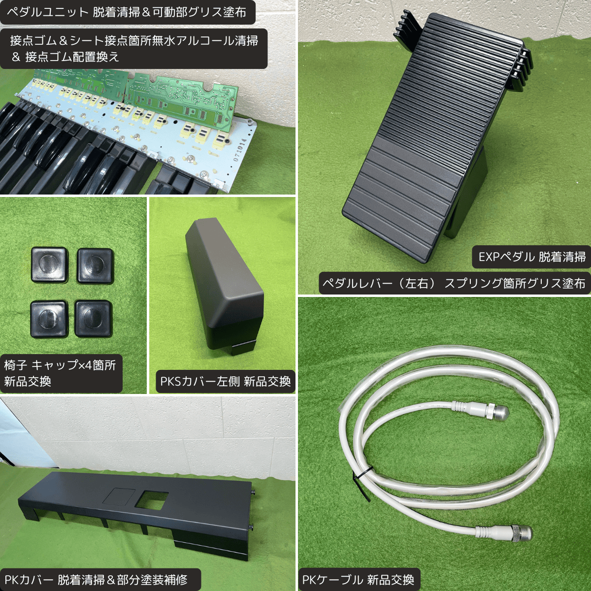 | ペダル | ・ペダルユニット:脱着清掃&可動部グリス塗布 ・接点ゴム&シート:接点箇所無水アルコール清掃&接点ゴム配置換え ・PKカバー:脱着清掃&部分塗装補修 ・PKSカバー:左側 新品交換 ★ ・EXPペダル:脱着清掃 ・EXPペダルレバー(左右):スプリング箇所グリス塗布 ・足鍵盤:コンパウンド磨き |